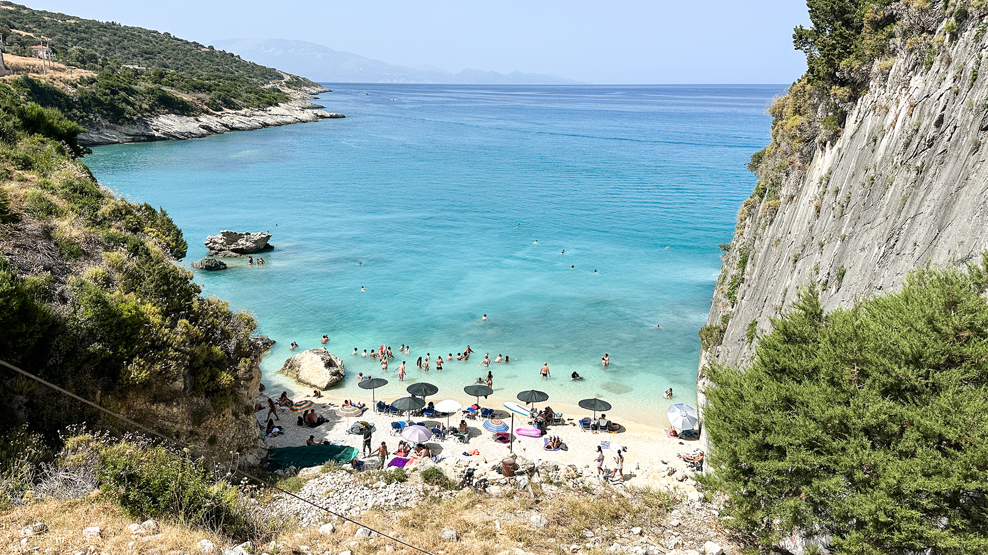 Wir fuhren schliesslich die malerische Küstenstrasse hoch bis Alikanas, und die andere wieder runter. Und dabei kamen wir an wunderbaren, versteckten Badeplätzen vorbei. An der Xigia Bucht zum Beispiel wo wir uns völlig überhitzt ins klare Meer warfen. Xigia-Strände gibt es mehrere. Inklusive Höhlen. Und in einer davon befindet sich eine schwefelhaltige Quelle, deren Erzeugnis gut für die Haut sein soll. Oberhalb der kleineren Xigia Bucht befindet sich ausserdem eine kleine Strandbar wo man sich verpflegen kann. Auch schön ist die Bucht von Porto Limnionas mit ihrem smaragdgrünen und auch erfrischendem Wasser (ein Tick kühler als anderswo). Hier gibts ausserdem ein Restaurant dazu, sowie windgeschützte Liegen mit schönstem Blick aufs Meer runter. Beliebt ist auch Makris Gialos in der Nähe des Dorfes Volimes und der Porto Vromi.