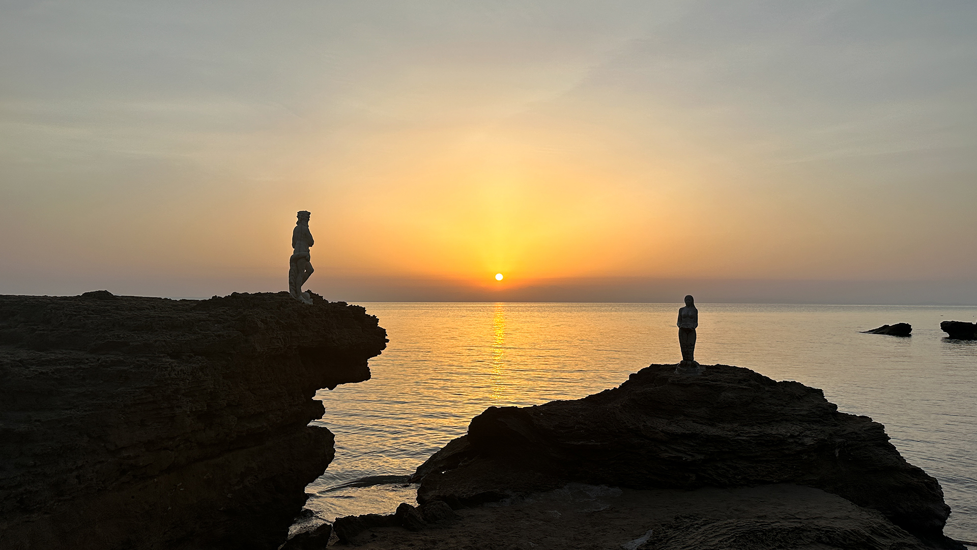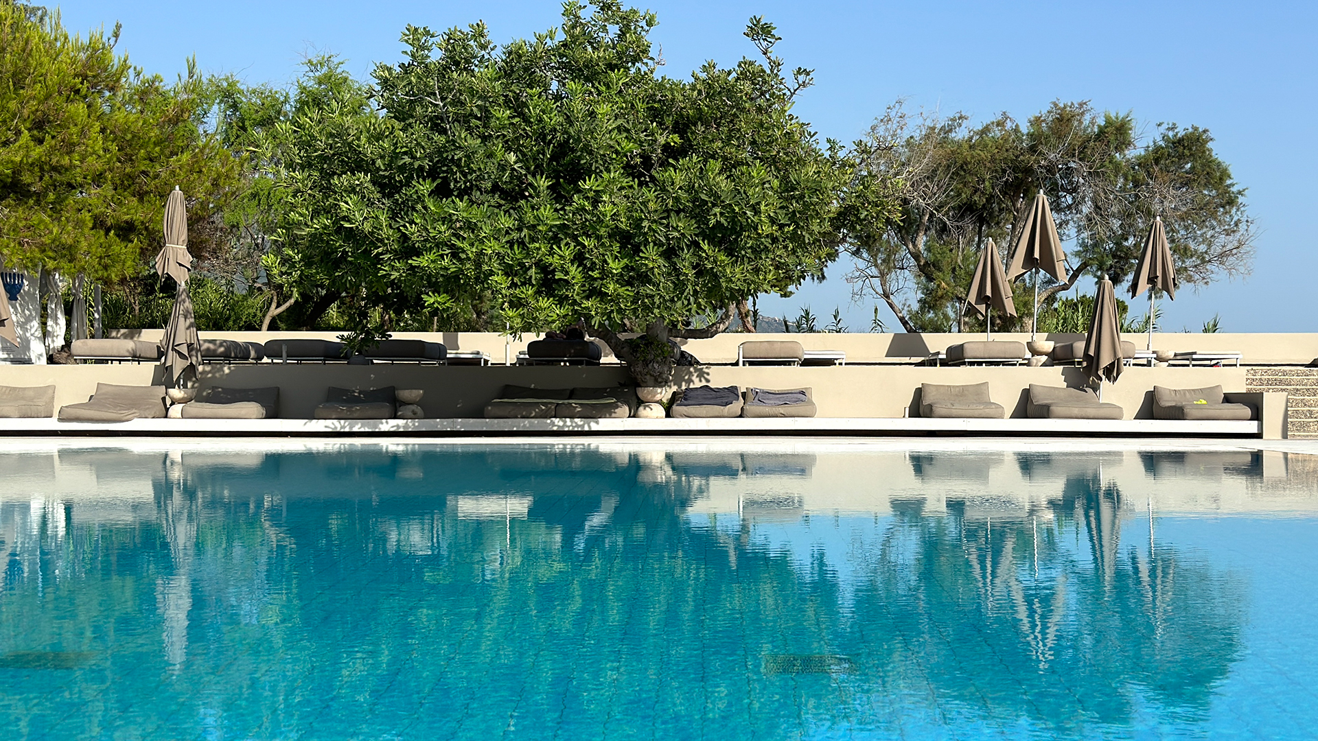Der Strand wiederum sauber, mit ebenfalls bequemen Liegen ausgestattet, in einer kleinen Bucht gelegen, inklusive Felsen, mit zwei Statuen bestückt, die jeden Strand aufpeppen. Und der Sand weich und angenehmen. Und schmerzhaft heiss. So wie es sich gehört. Und so steht man da, zwischen Poolleben, kleiner hotelinterner Meeresbucht, klarstem Wasser und im Sand verteilten Liegekissen und kann sein Glück gerade nicht so ganz fassen, weil alles so schön ist und ruhig und gediegen und warm und türkisfarben.